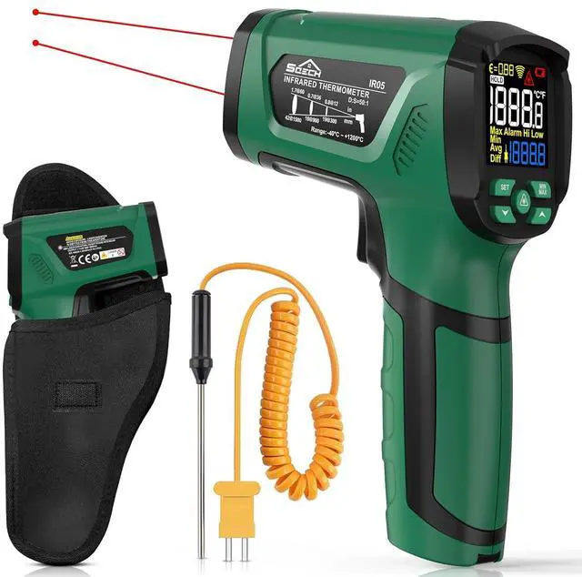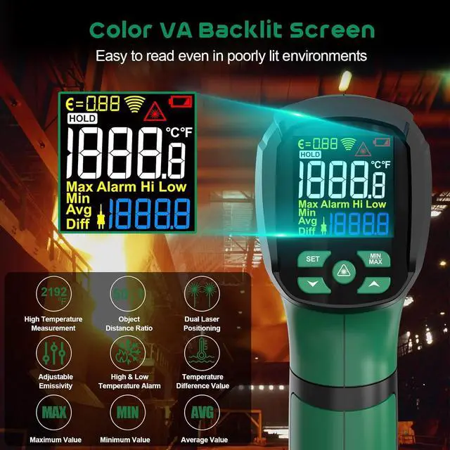 High PerformanceThe laser thermometer gun uses a color VA backlit screen, which allows easy reading of measurements in low-light environments. The high temp thermometer also provides functions such as / unit switching, data hold, low battery indicator, and a 35-second automatic shutdown function to save power and extend battery life. The included carrying bag is convenient for storage and carrying.