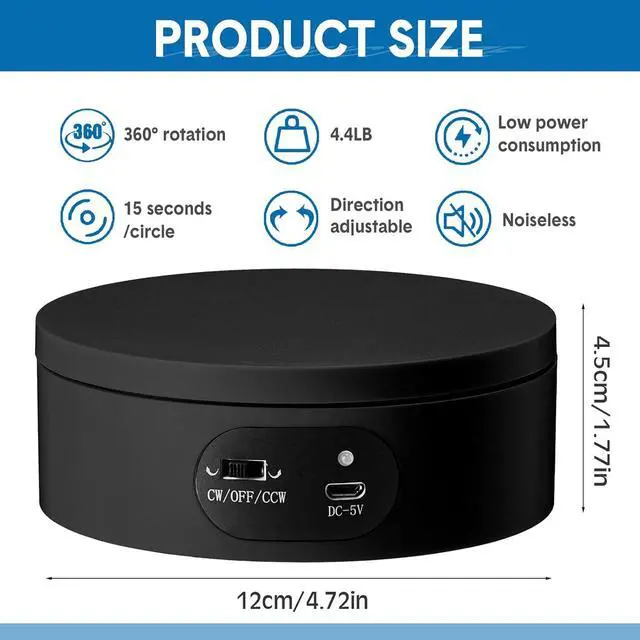 Power Supply Methods: the photography turntable for glitter tumbler has a USB port and comes with a USB power cable(The latest batch of products has been upgraded to Type-C Port and Type-C power cords); Besides, the battery can be installed at the bottom of the turntable, so you can choose the appropriate power supply mode according to your preferences or the actual needs