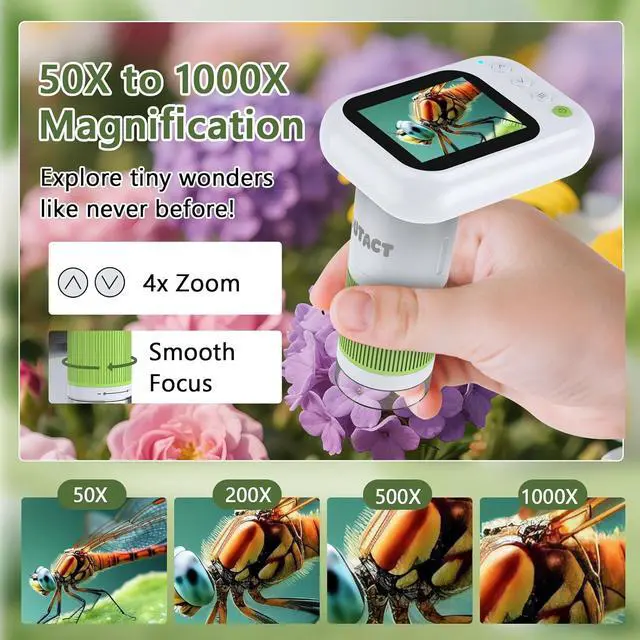 Magnification & Adjustable Lighting: Discover microscopic wonders like never before! This kids' digital microscope offers 50x to 1000x magnification, 4x zoom, and 4 adjustable LED brightness levels. Plus, the adjustable LED light provides perfect illumination for crystal-clear discoveries.