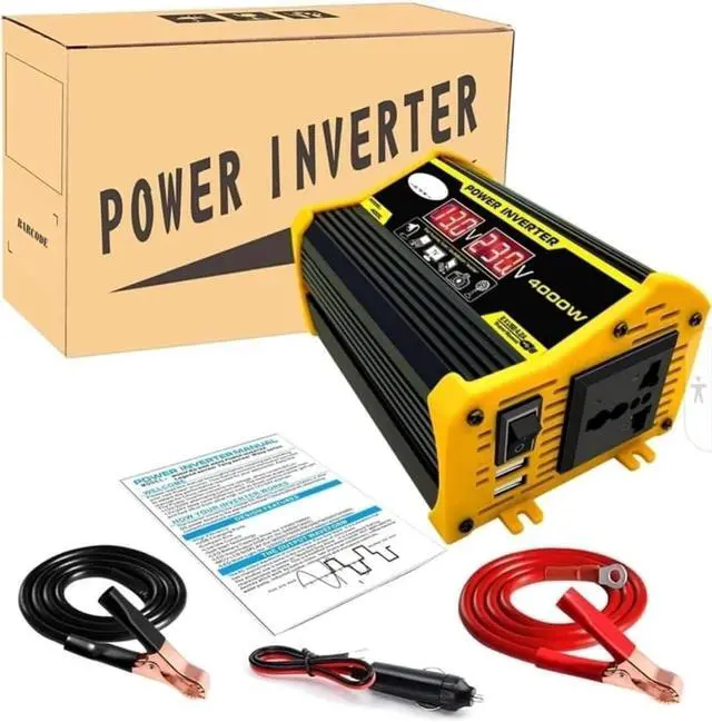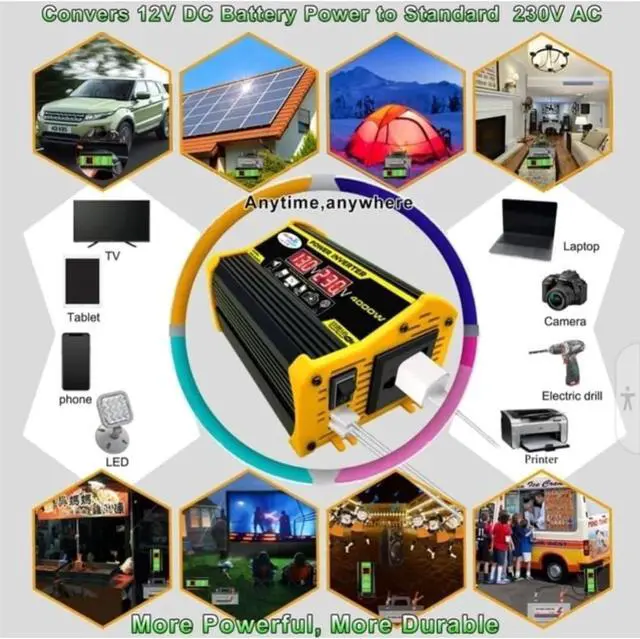 HIGH CAPACITY: Powerful Peak4000W inverter converts 12V DC to 220V AC, ideal for powering appliances, tools, and electronics in your car, RV, Truck, boat