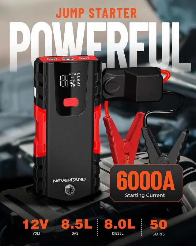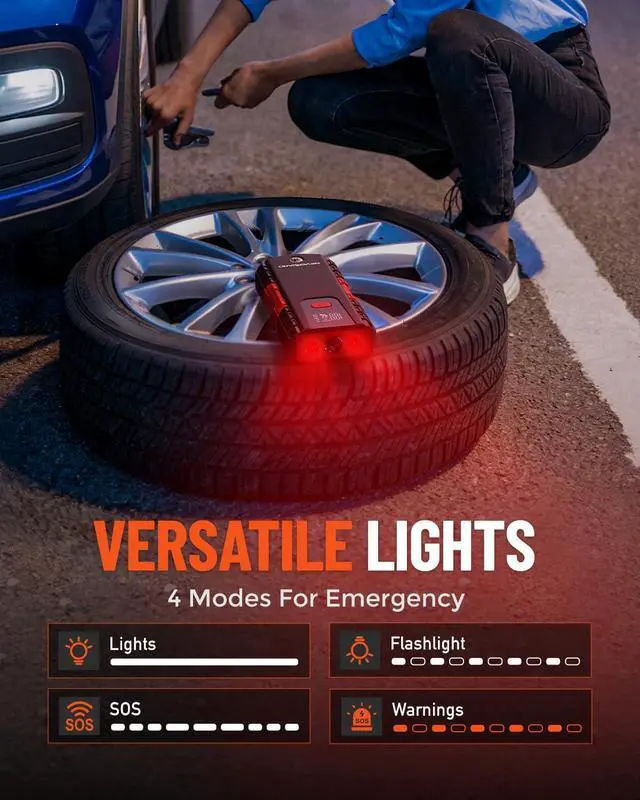 Your Roadside LifesaverEquipped with a 4-mode LED flashlight (lighting, strobe, SOS, warning light), the car battery charger jump starter provides reliable illumination during roadside emergencies, camping, or outdoor adventures