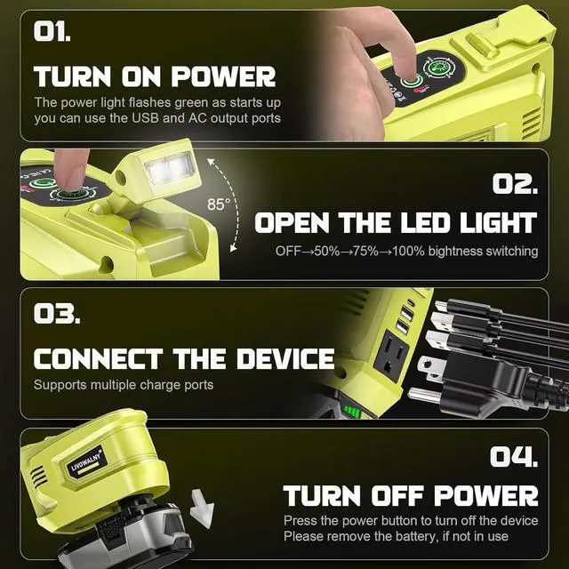 Excellent Security: This outlet adapter built in fuse to protect your device, safe charging design provides protection against short-circuits, over-current, under-voltage, low-load, over-heat, over-voltage, over-load, and over-drain situations. (You need to take the battery off when finished your work, otherwise it will drain your battery. )