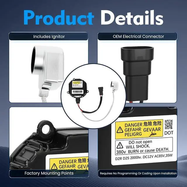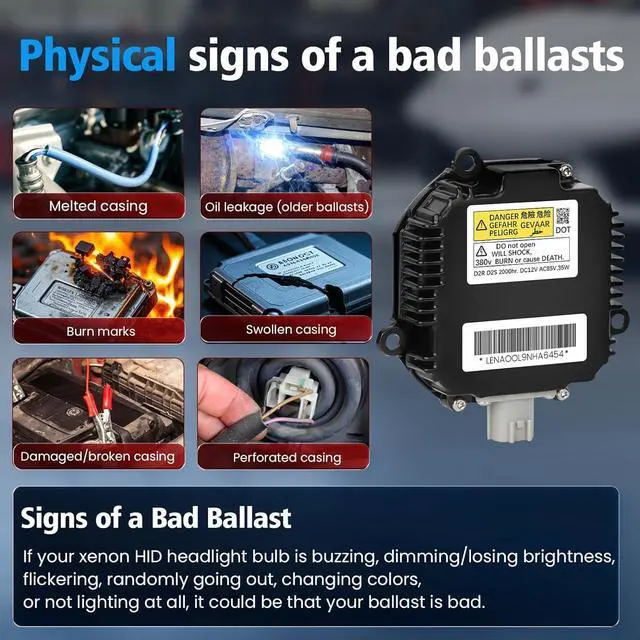 XENON HID HEADLIGHT BALLAST REPLACEMENTCommonly referred to as a headlight control module or HID power regulator, provides the voltage needed to start the lamp and regulates the electrical current of the light once it is lit. When the voltage is input, the output power of the ballast can be kept constant at about 35W or 50W to protect the HID bulb from damage. This universal component is compatible with both driver and passenger side HID headlight assemblies, ensuring reliable performance.