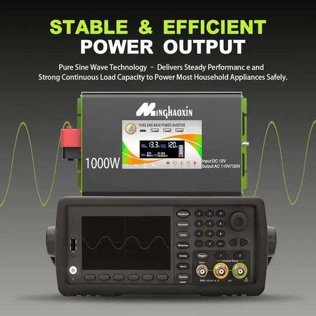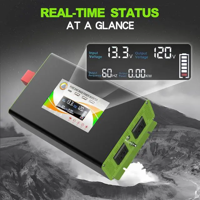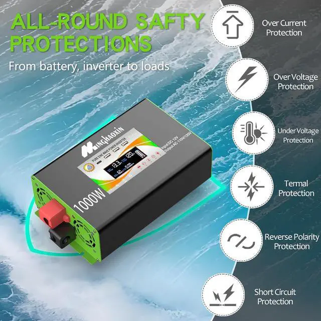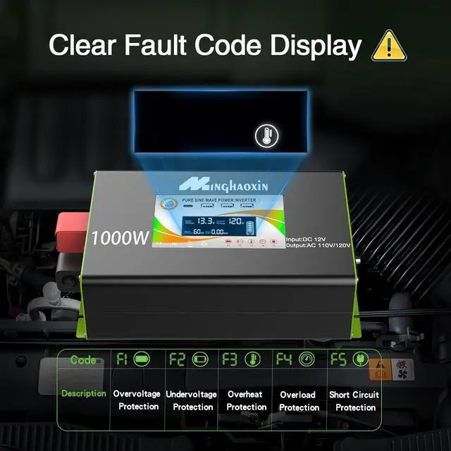 Comprehensive Protection SystemOur inverter 12v to 110v is built-in multiple safety protections including reverse polarity, short circuit, overload, overvoltage, undervoltage, overheat protection, and GFCI (Ground Fault Circuit Interrupter) for enhanced electrical safety. Ensures stable performance and protects both your inverter and connected devices during operation.