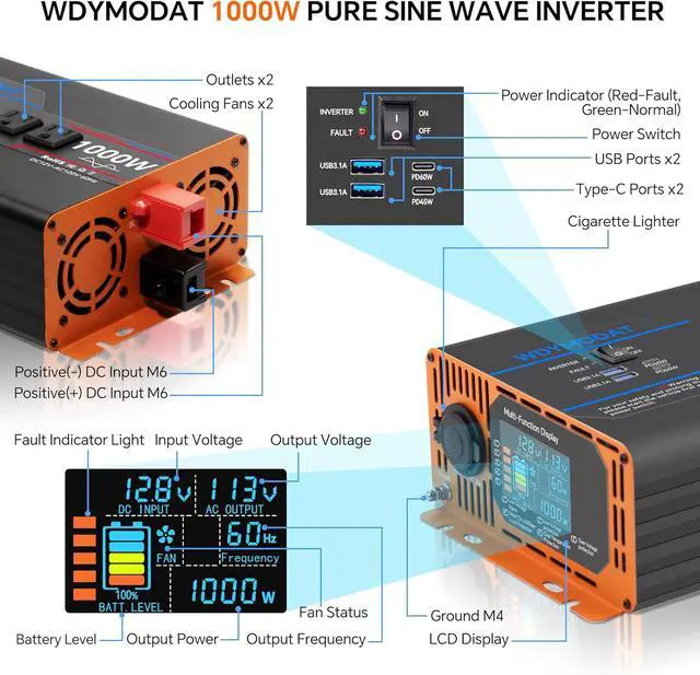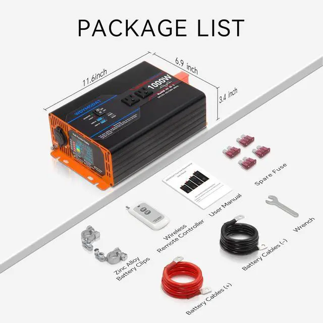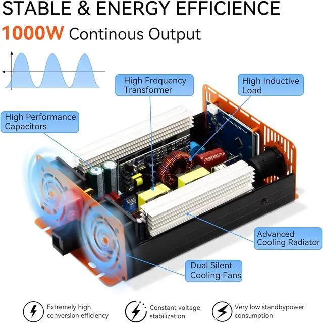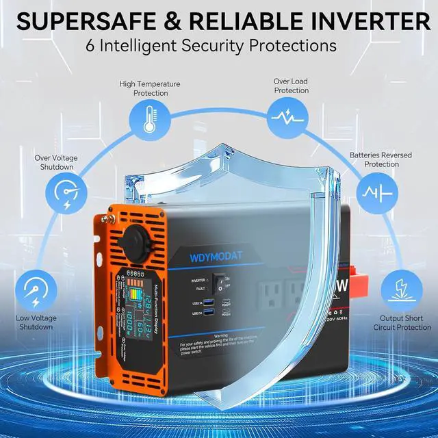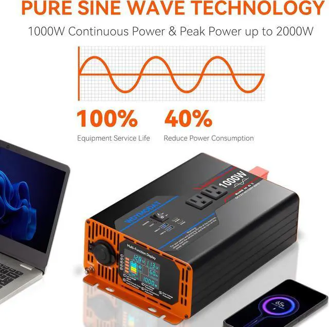 Widely ApplicationOutputting pure sine wave, that is comparable to public grid utility wave. This allows the power inverter to quickly power multiple electronic devices at the same time, meeting your needs for outdoor use of small appliances such as refrigerators, air conditioners, televisions, microwaves, ovens, laptops, DVDs, players, cell phones, iPads, PSPs and cameras and more.