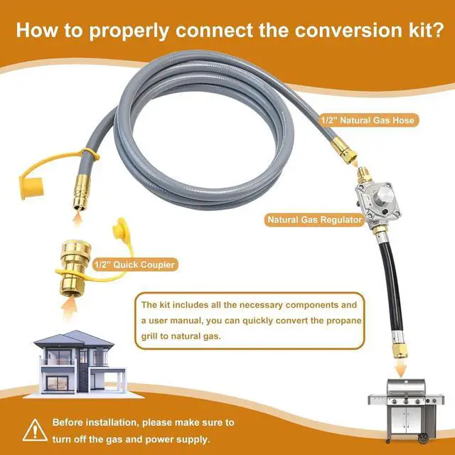 Product List This gas conversion kit for weber grill includes: 1/2" natural gas hose (10FT or 15FT), natural gas regulator, 1/2" quick coupler, 3/4" male flare adapter, orifice hex wrench, brass orifices(16pcs+4pcs Spare orifices), high temperature resistant PTFE tape and user manual.