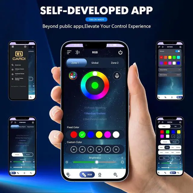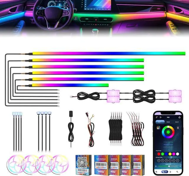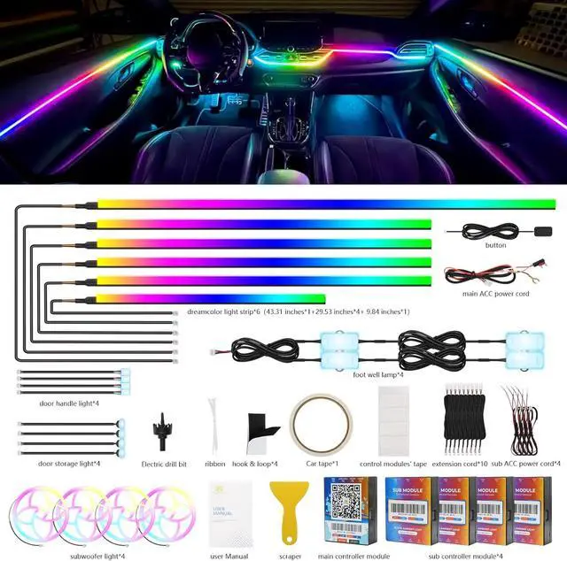 Upgrade Installation Complete Kit Easy to install! Our unique partition instal design connectors eliminate complexity. The comprehensive kit includes 6 premium Dreamcolor light strips (1x 43.3", 4x 29.5", 1x 9.8" ), 1 main controller, 4 sub-controllers, all necessary cords (main ACC, sub ACC, extensions), a hidden button, and a full installation package everything needed for a seamless car mods project.