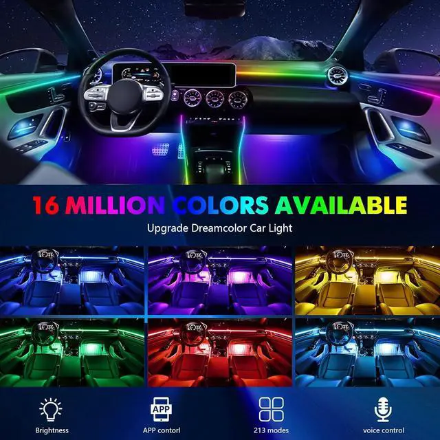 Kit includes: 6x Dreamcolor Light Strips 43.31 inches*1+ 29.53 inches*4+ 9.84 inches*1, 4x foot well lamps4x door storage lights4x door handle lights4x door speaker lights6x Extension Cords, 4x Sub ACC Power Cords, 1x Main ACC Power Cord, 1x Hidden Button, 1x Main Controller, 4x Sub Controllers, 1x Full Installation Package. Transform your vehicle with premium car led lights interior wireless ambient lighting today!