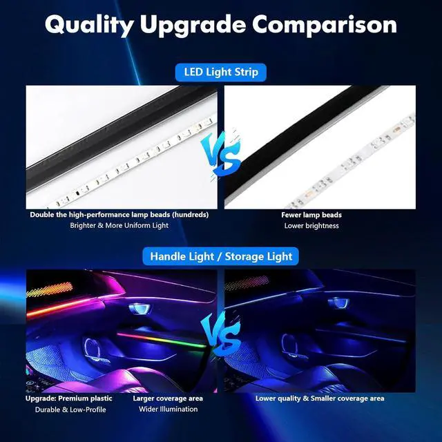 Superior Coverage & Low-Profile Design Enjoy wider illumination thanks to the larger coverage area of our meticulously designed strips. Crafted with premium plastic for a durable & ultra low-profile fit, they integrate invisibly into your car decor without bulky protrusions. This quality upgrade ensures a sleek, professional look unmatched by flimsier interior car accessories.