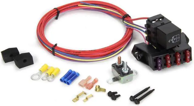 This kit includes: 40-amp SPST relay, 40-amp circuit breaker, Relay base/fuse block with harness, Crimp-on terminals and mounting hardware.