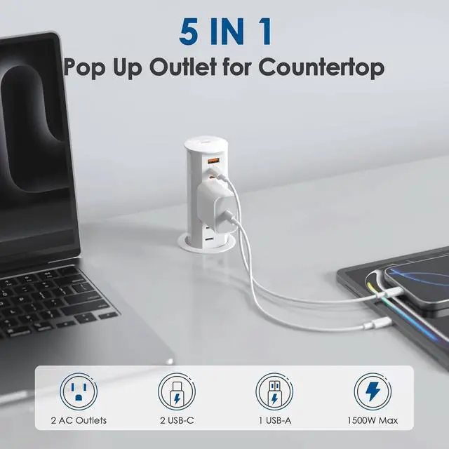 Water-Resistant and Durable: Crafted with refined hardened scratch-resistant PVC plastic, this splash-resistant pop-up countertop receptacle is built to last. Accidental spills can be easily wiped away, allowing the outlet to continue functioning normally. Its the perfect blend of durability and convenience for any kitchen countertop or office space.