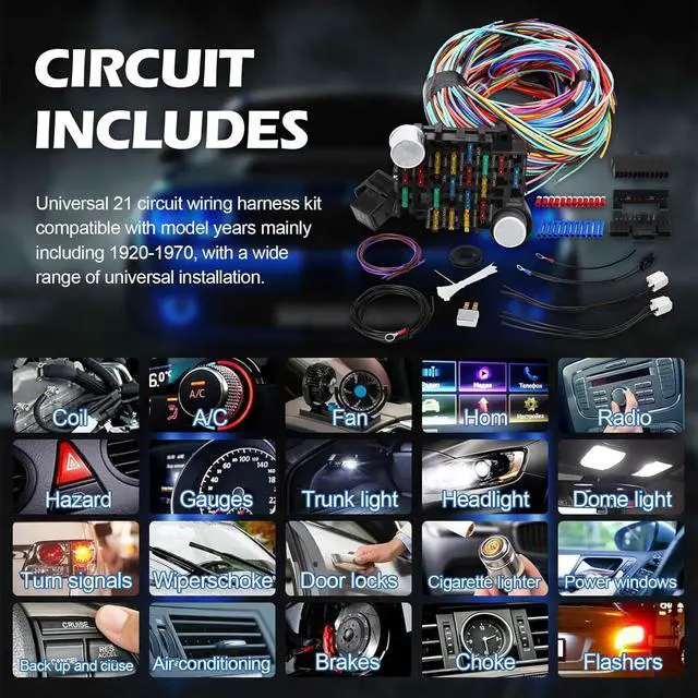INCLUDED CIRCUITS: Universal wiring harness kit included circuits are: horn, fan, dome light, hazard, radio, cigarette lighter, door locks, brake, headlights, trunk light, gauges, back up and cruise, wipers, choke, coil, a/c, electric fuel pump, power windows and turn signals