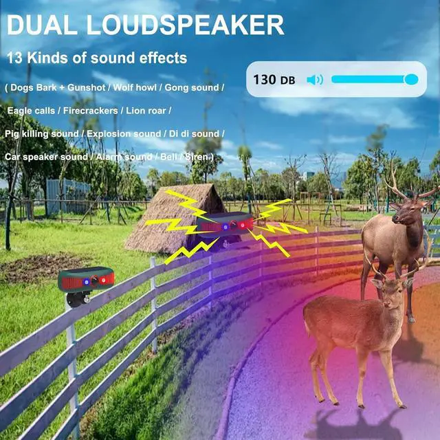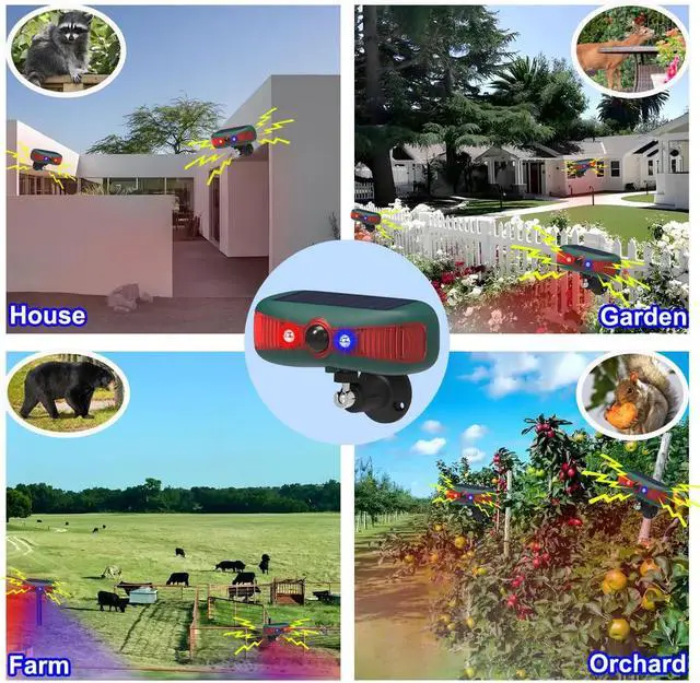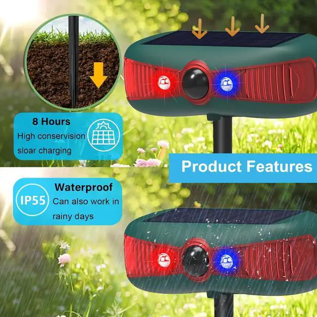 2 Installation MethodsCan be inserted into the ground with stakes, or mounted on a wall or post with the included screws. Just find a sunny spot and install it on the ground or wall/fence. Suitable for farms, ponds, orchards, gardens to drive away animals, and also suitable for indoor sheds, barns, warehouses to drive away mice.