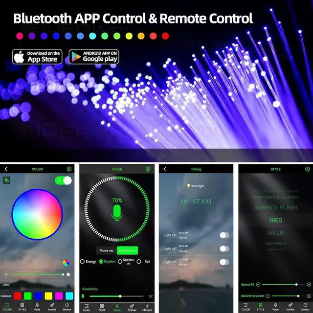 Timer Function allows the Fiber Optic Light to light up at the time you want; you also shoot the colors around you for show on the lights; you can create more amazing lighting effects.