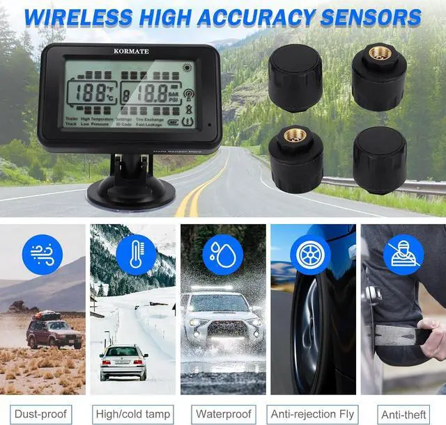 7 Alarm Modes- High&low pressure alarms / high-temperature alarms / sensor low battery alarms / fast tire leak alarms / sensor data loss alarms / display low battery alarms. Allowing you to focus on a long distance on freight or journey.