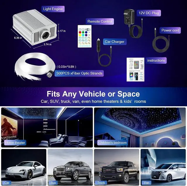 Fiber Optic Light Kit Multi-Scene Magic: Our fiber optic light kit transforms cars and homes into starry heavensideal for ceilings, bedrooms & theaters. Child-safe fibers (non-conductive, no heat).
