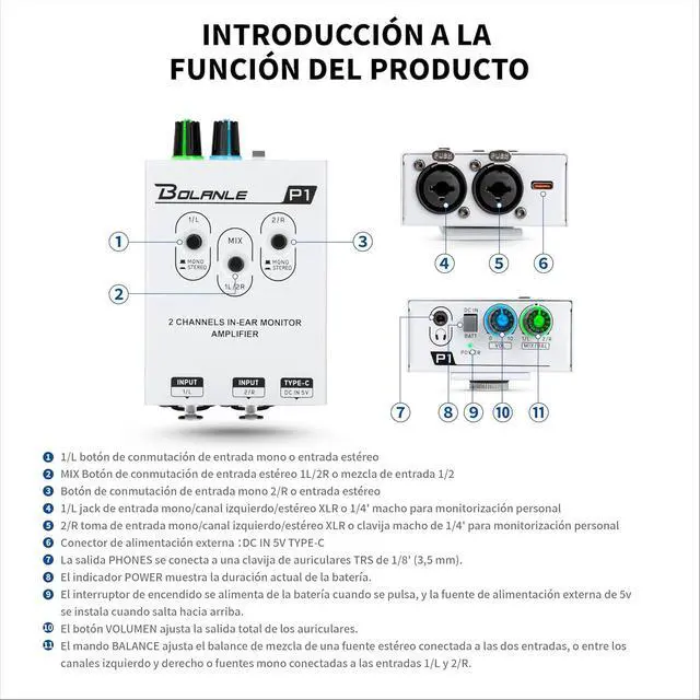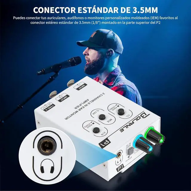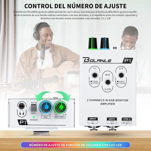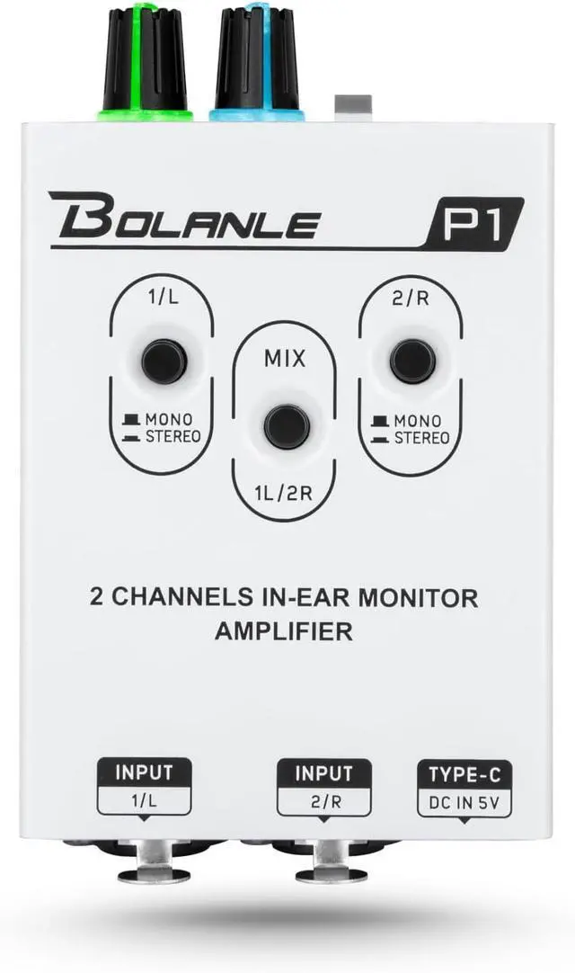 IN EAR MONITOR SYSTEM: This ear monitor can amplify sound and has two top knobs. The VOLUME knob adjusts the total output of the earphone, and the BALANCE knob adjusts the mixing balance of stereo sources connected to two input terminals, or adjusts the balance between left and right channels or mono sources connected to input terminals 1/L and 2/R.