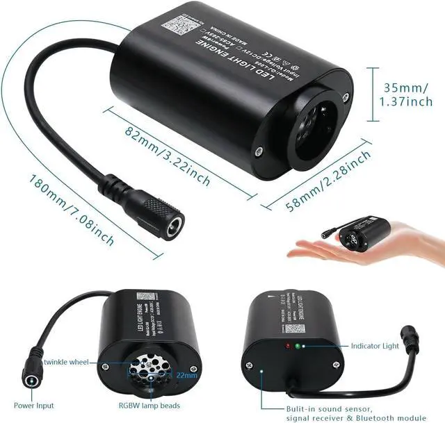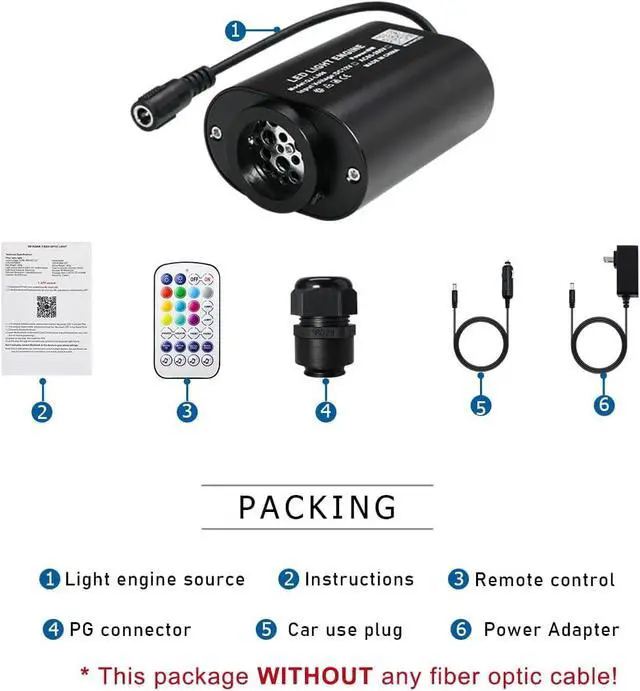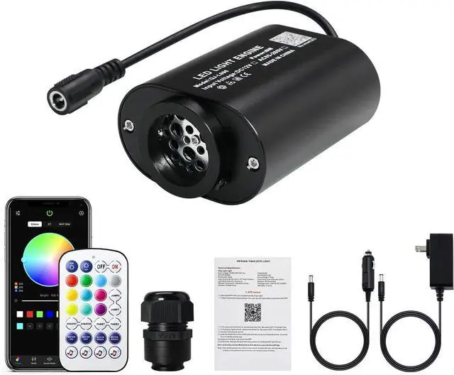 SPECIFICATION6W mini size twinkle App light engine (2-year warranty). With 28-key RF remote controller, US power adapter and car use plug. Notice Package NOT INCLUDES any fiber optic strands. You need to buy separatly.