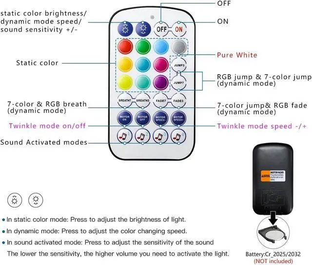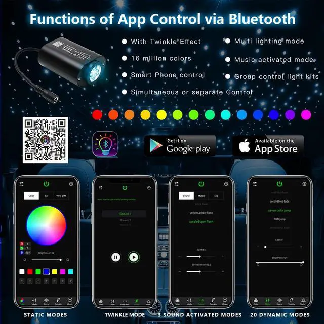 Remote Control + APP ControlRemote with 10 static color (pure white, red, green, blue, yellow, ice blue, purple etc), 6 dynamic changing modes (3/7-color jump or fade, breath), 4-level twinkle speed, brightness and dynamic mode speed adjustable. Also can use APP control after Bluetooth connected with the light engine. 16 million colors and brightness 1%-100% for you to choose. Set your more than 1 set of light kits in group to control.