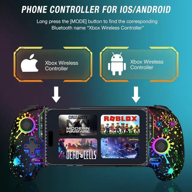 Universal Wireless ConnectivityExperience seamless Bluetooth pairing with this premium mobile game controller for Android and iPhone. Simply hold the MODE button for 3 seconds until the blue LED flashes rapidly, then select " Wireless Controller" in your device's Bluetooth settings. The iPhone controller remembers your device for instant reconnection, making it the most convenient phone controller for gaming on the go