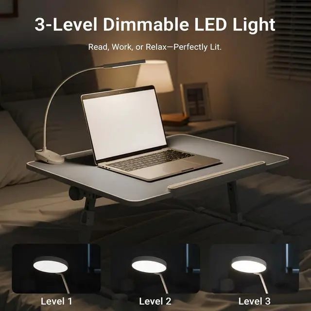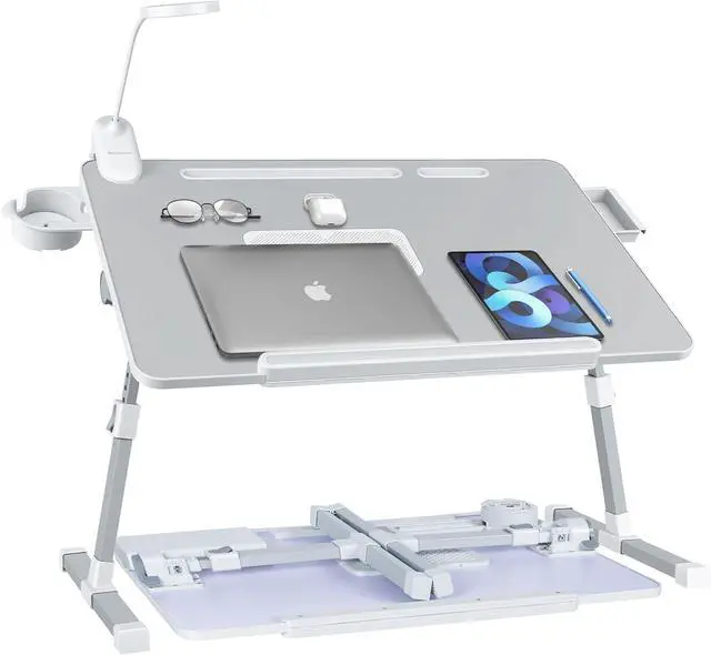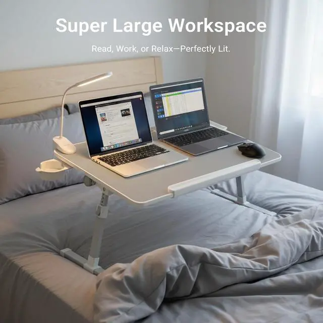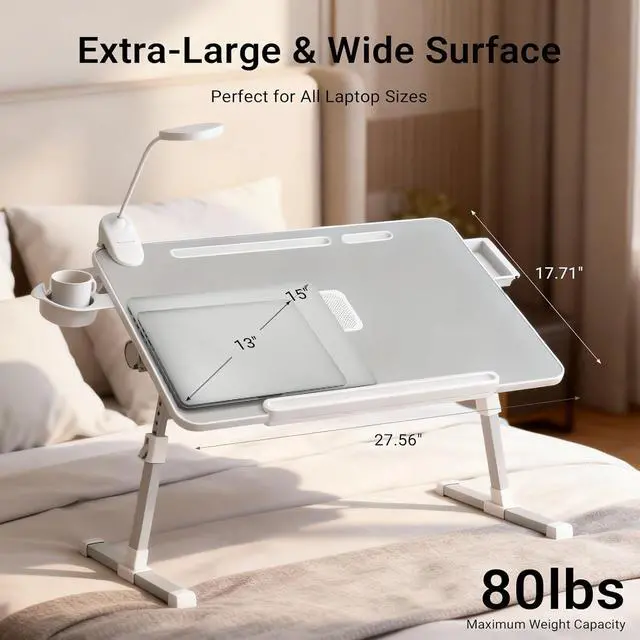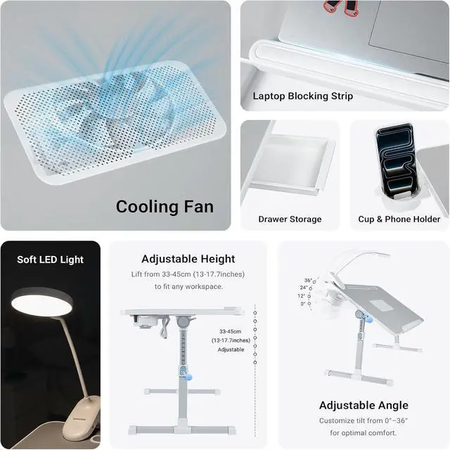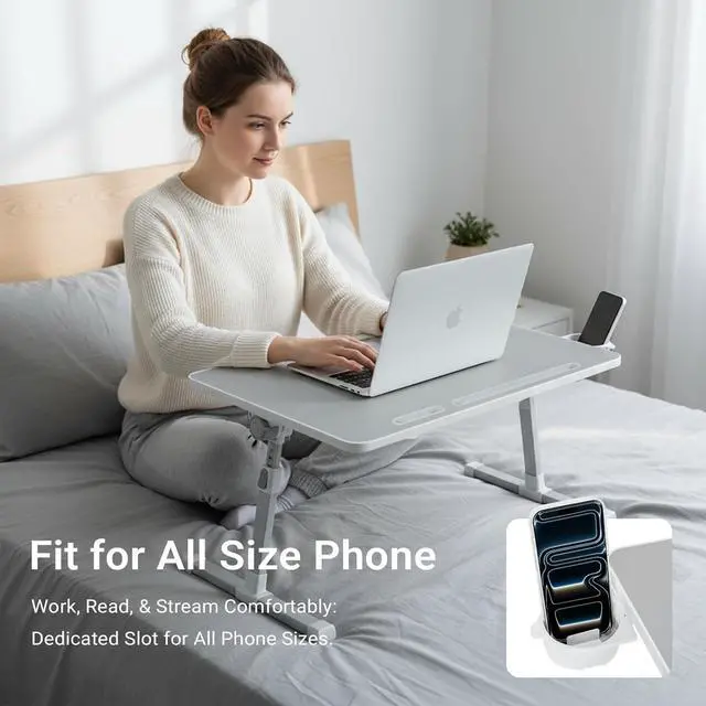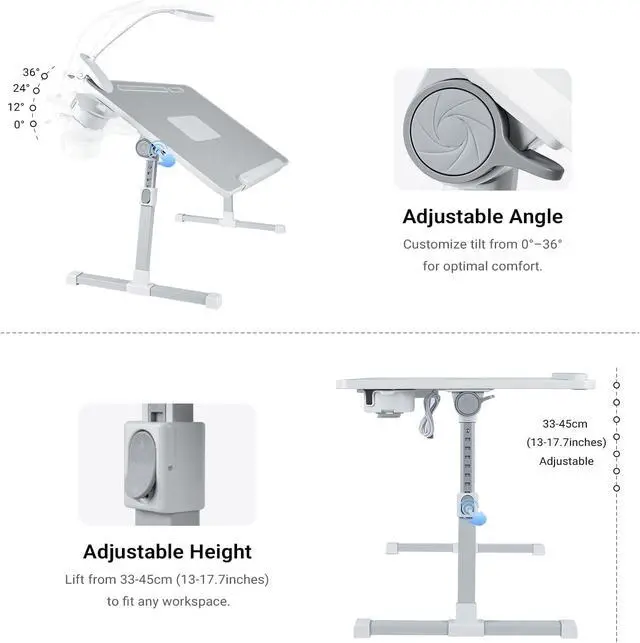 Adjustable Size for Optimal UseMeasuring 27.55 x 17.71 inches (70*45cm), this height-adjustable laptop table adapts from 12.99" to 17.71" (33-45cm), thanks to its convenient auto-lock buttons. Its foldable legs ensure easy storage, and the 27.55 inches leg clearance offers comfortable movement. The tabletop's angle is adjustable up to 70°, promoting better posture and reducing strain.