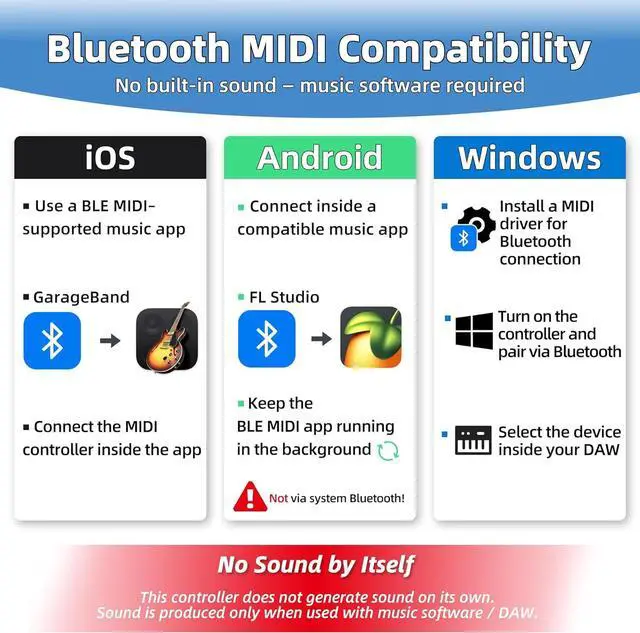 Bluetooth MIDI Compatibility: For iOS devices, connection is supported via BLE MIDIcompatible music apps (e. g. GarageBand). For Android devices, Bluetooth MIDI must be connected inside a compatible music app, such as FL Studio (not through system Bluetooth settings). For Windows, a MIDI driver is required for Bluetooth connection. No Sound by Itself Use with music software / DAW.