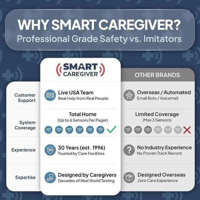 System includes Caregiver Pager (TL-2020P) and 24in x 48in Wireless Floor Mat (PTFM-07C), and comes with 1-year manufacturer warranty. Pager requires 2 AA batteries (NOT INCLUDED). Smart Caregiver is an American company with 30 years supporting caregivers and enhancing safety for seniors and elderly.