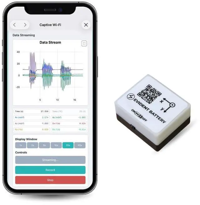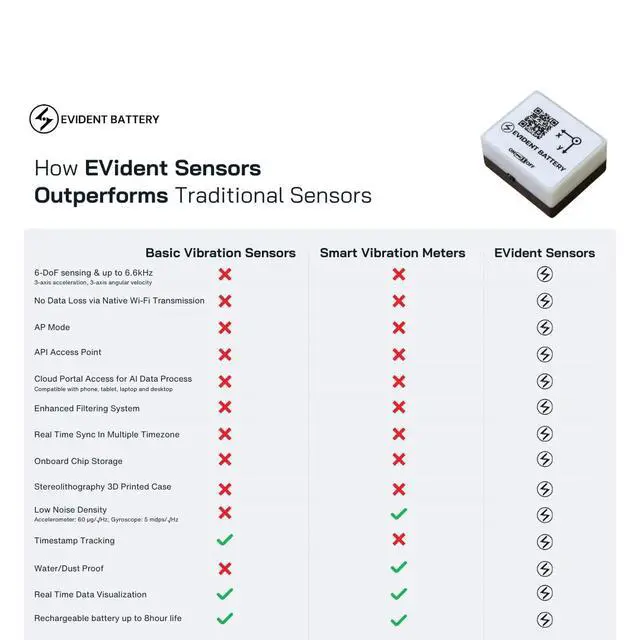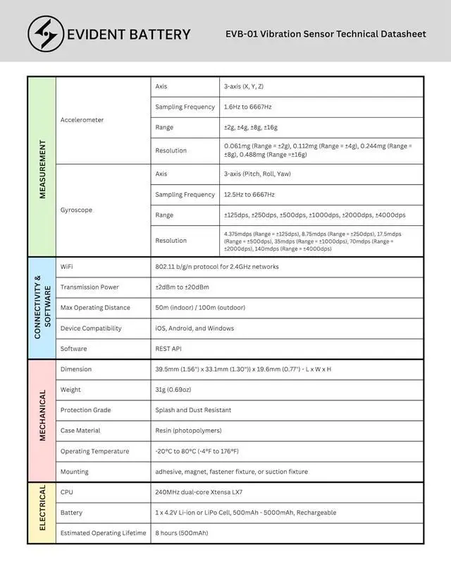 a. The Vibration Sensor (Model EVB-01) delivers precise, timestamped motion and vibration data up to 6.6 kHz with 6 DoF 3-axis accelerometer and 3-axis gyroscope factory-calibrated for accuracy up to 0.000061 g / 0.0044 °/s. b. Designed with Wi-Fi ( 2.4 GHz) for seamless real-time data transmission and optional AP Mode for offline use, users can stream data directly to their browser or the EVident Platform (evbdata. com) without installing software. c. Powered by a 240 MHz dual-core microcontroller and 16 MB flash memory, the sensor processes high-frequency readings in real time, eliminating lag during vibration capture and ensuring reliable traceability.