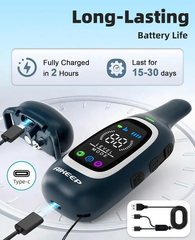 Fast Charging & Long Battery Life with a high-capacity rechargeable battery, the dog shock collar receiver lasts 15+ days and the remote lasts 30+ days on a single 2-hour charge.