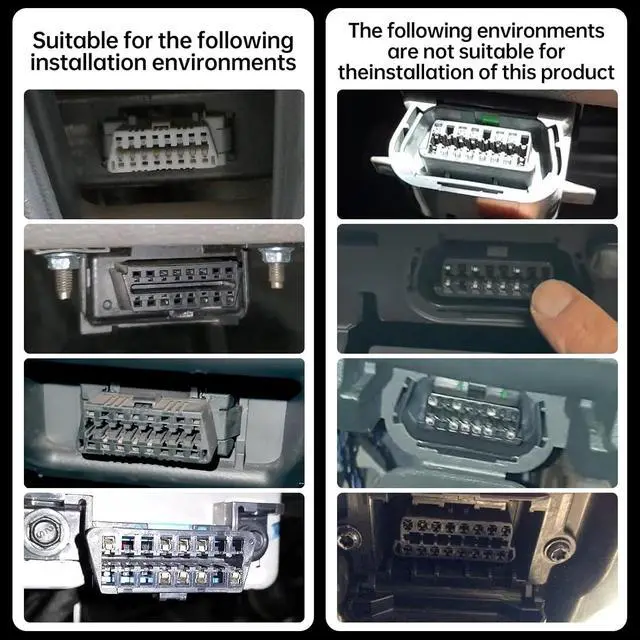 Note: The OBD2 port on some vehicles is located in a confined space and may not be suitable for installation. However, if the OBD connector is exposed, installation will be seamless. During installation, align the OBD connector vertically to ensure a full engagement. First, screw in the two screws, then apply additional force to tighten them securely. We have designed multiple screw specifications; the screws you receive may differ from those shown in the image.