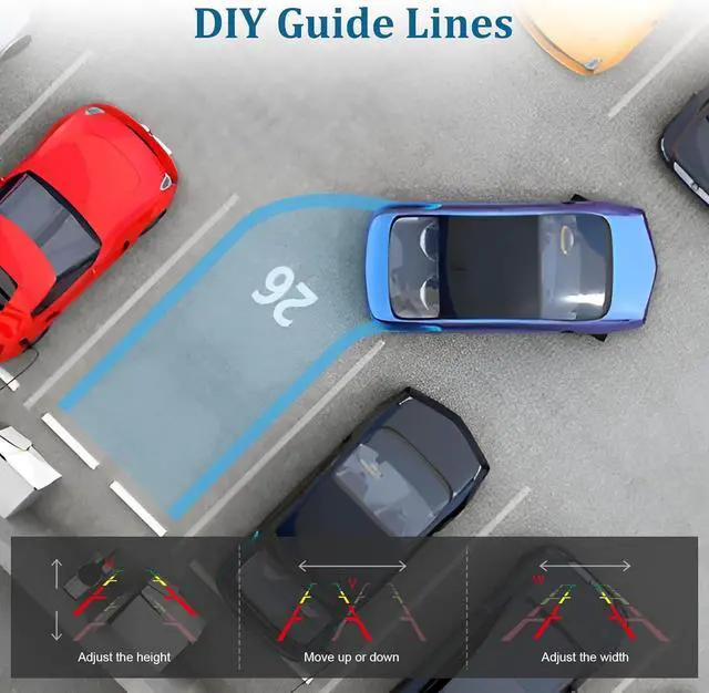GUIDE LINE ON/OFFUsed as a front or rear camera, equipped with DIY reversing line and mirrror function. you can adjust the width of the parking line, move it left/right/up/down for fast and accurate reversing or parking, Also with adjustable brightness, contrast, saturation, tint and language for a perfect viewing experience.