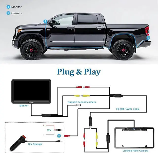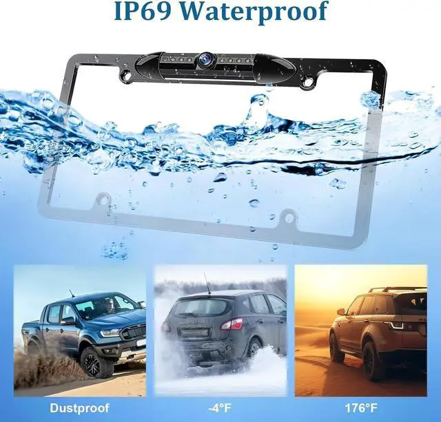 IP69 WaterproofIP69 waterproof design, which can work perfectly and provide clear images in extreme environments from -22°F to 176°F. Even in rain /snow/dust/dog day, you can see road conditions clearly. This License Plate Backup Camera still works in extreme weather, provides a clear image without delay.