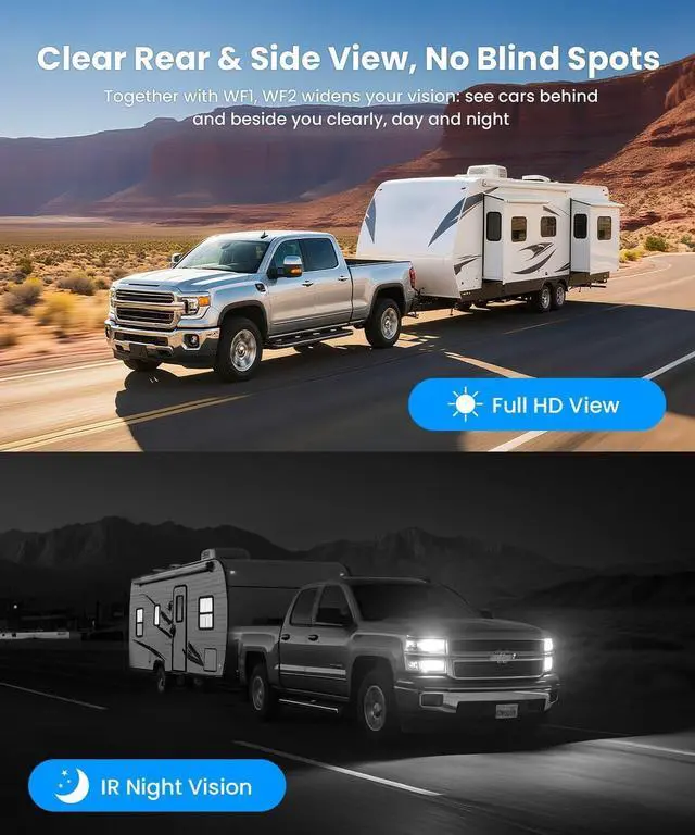 Strong Signal for Large RVDesigned to work seamlessly with the WF1 RV rear view camera systems stable wireless connection, delivering smooth video on travel trailers, fifth-wheel trailers, and campersno lag, even on bigger rigs