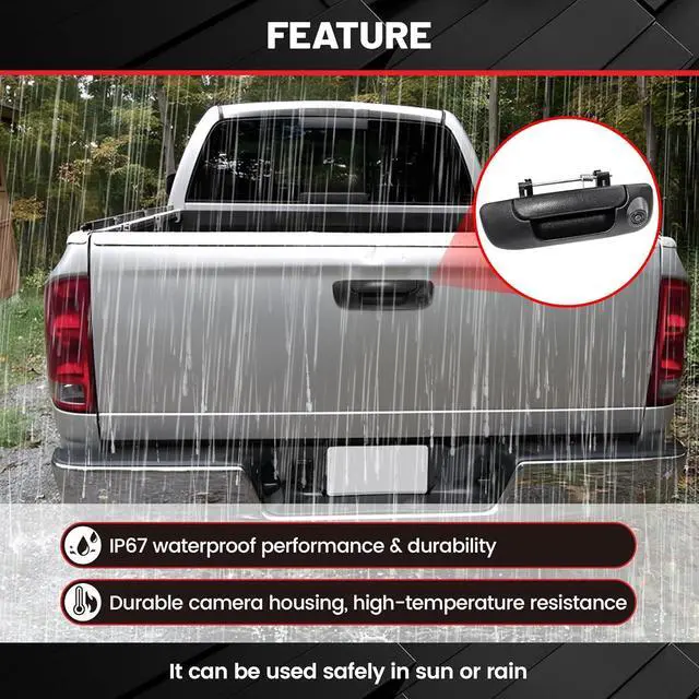 Waterproof: IP67 waterproof housing with anti-fog lens, resistant to dirt, dust, mud, and water; Durable seal housing, tailgate handle w/rear view backup camera shell is made of strong and tough material; Keep reverse camera working well in rainy foggy and dust weather