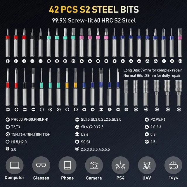Multi-functionalThis precision repair kit is suitable for most electronics products, computers, laptop repair tool kit, watch repair tools & kits, cell phone devices, glasses, cameras, etc, as well as other precision instruments, This pc tool kit with drill is a practical gift for fathers and boyfriends, Tech gadgets for men, repair enthusiasts and craftsmen's perfect gift, Tool set for home