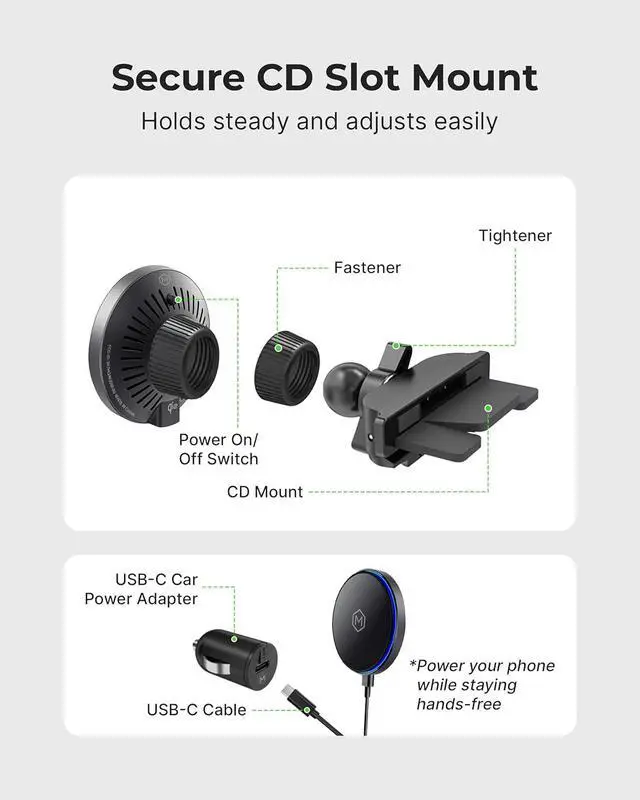 Strong Magnetic Grip: Securely hold your iPhone with the cd slot phone mount featuring N52 magnets providing 1200gf strength. Designed for Mag Safe CD car mount compatibility to ensure stability during every drive.