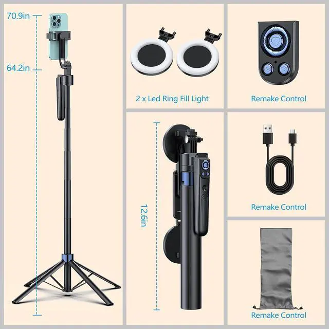 Versatile 3-in-1 Design & Extendable StickThis 3-in-1 phone tripod stand functions as a handheld selfie stick, a desktop stand, or a floor tripod. Extend to 180cm ( 70.9 ), fold to just 32cm ( 12.6 )The extendable stick design is more convenient for travel and daily needs, everything from family gatherings to on-the-go vlogging, all while providing a stable base for your devices