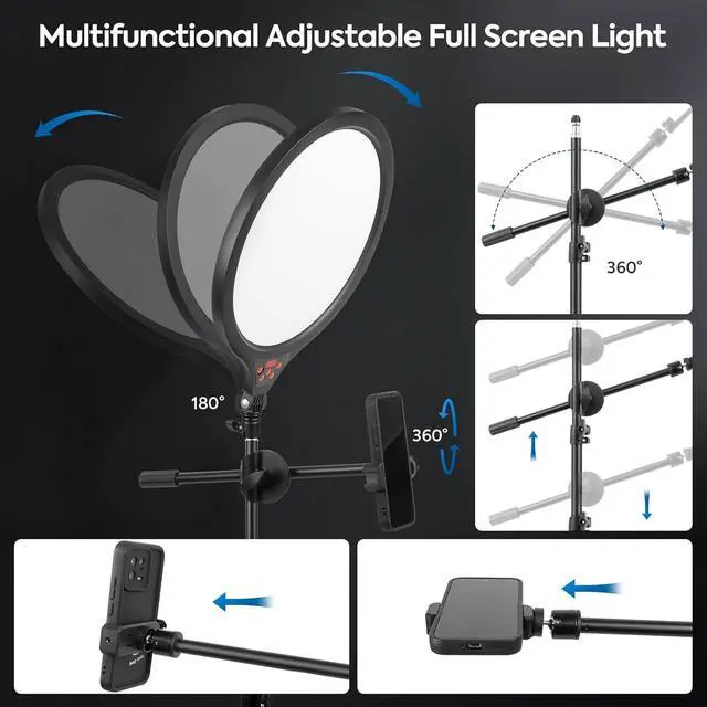 Overhead and Multi-Angle Shooting StandThis selfie light comes with a dedicated phone mount that can be securely fixed to the light stand and rotated 360° for full flexibility. It enables adjustment in all directionsup, down, forward, and backward, making it ideal for overhead food photography, drawing live streams, and social media content creation. Achieve professional multi-angle presentations with ease.