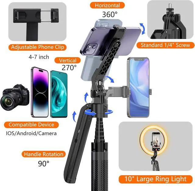 Sturdy Four-Leg DesignMade of high-quality aluminum alloy, this tripod for iphone with light ensures durability and exceptional stability. Specifically designed for iPhones, it features extendable four legs and an umbrella-like frame structure, combined with enhanced four-point support, metal ribs, and an aluminum alloy keel at the base, ensuring excellent stability during video recording. The bottom has a one-click switch for easy opening or folding, providing convenience and ease of use