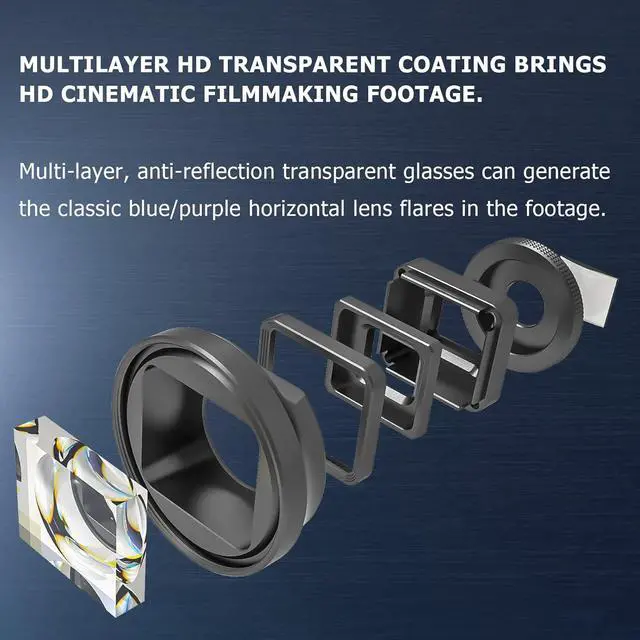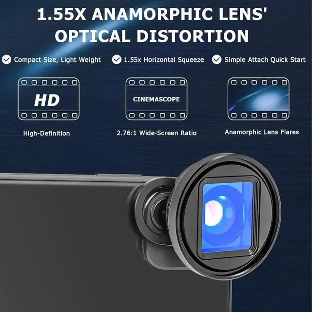 Quick Start with Phone Mount Clips for More Phone Mounting Possibility. 1.55X anamorphic phone lens is with a universal and metal phone clip for your phone lens attachment, anamorphic lens is quickly start to assemble and use effortlessly, you can use it on any phone gimbal or phone rig to shoot a super wide-angle cinematic landscape photography and videography.