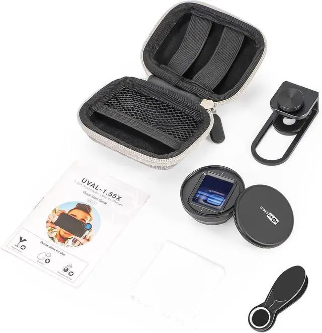 Get: 1x 1.55X Anamorphic Lens (including 2 lens covers), 1x Universal phone clip, 1x Metal phone clip, 1x Storage Case, 1x Cleaning Cloth, 1x User Manual.
