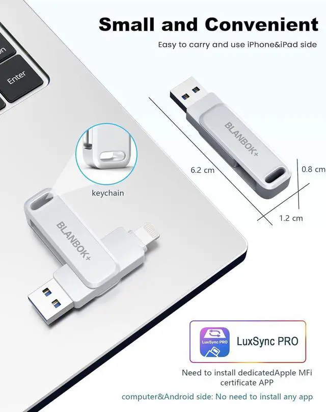 One-click Backup: Plug and play. With this MFi-certified iPhone usb flash drive, you can easily back up photos, videos, and phone book on your phone by One-Click from the APP, and you can also use the USB side to store your own backups on your computer for double insurance. (Tip: iPhone/iPad needs to download APP from APP Store when using jump drive; Android phone needs to turn on OTG function, no app required)