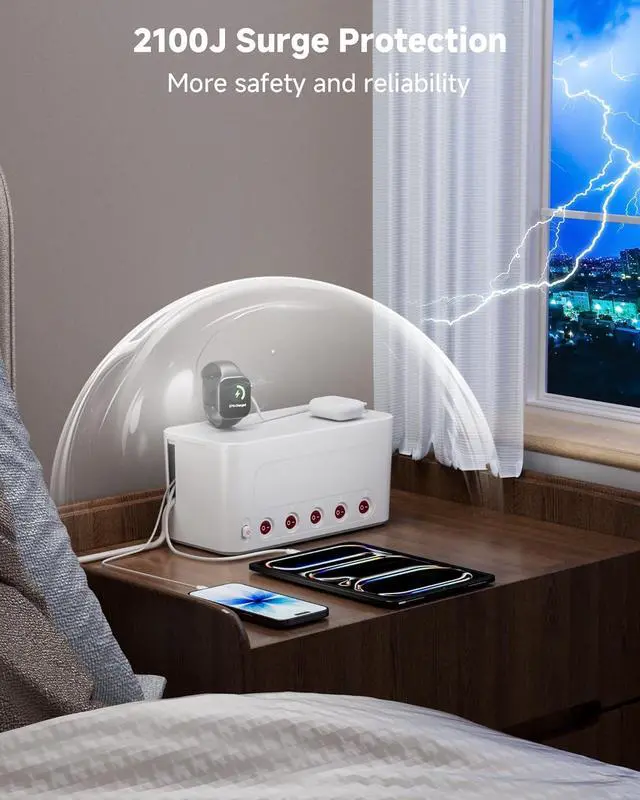 Surge Protector Power Strip: The flat surge protector power strip features a built-in 2100J surge protection circuit, effectively resist and reduce the impact of voltage fluctuations and lightning strikes, safeguarding valuable equipment such as Computers, TVs, Game consoles and Audio systems. The extension cord box with multi outlet extender surge protector offers multiple protections, including overload, overcurrent, overvoltage and overheating. Provide safe and reliable power supply for you