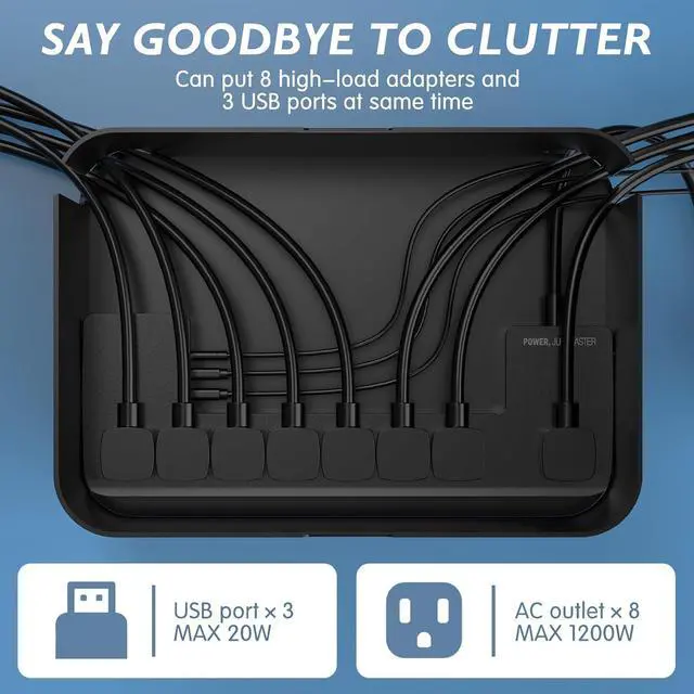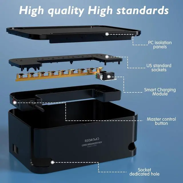 : Made of high quality flame-retardant ABS+PC material with high temperature resistance performance of 1382, the 6.6F t extension Cord with organizer box is also assembled with high-quality components and circuits, equipped with an overload protection switch, which give your appliance full protection against electrical shorts, overheating and overcurrent etc