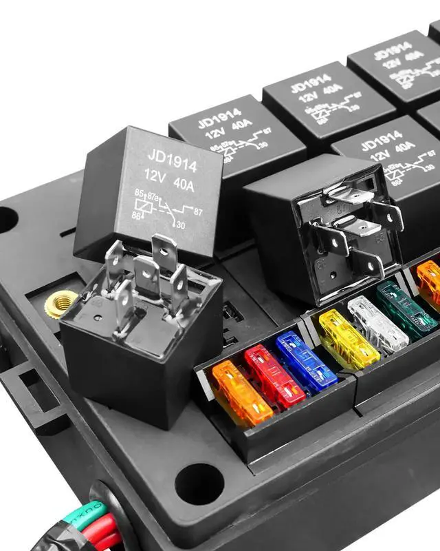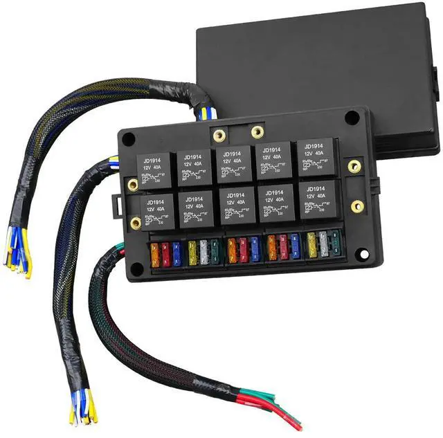 The fuse relay box is designed with a 10-slot relay panel, suitable for 4-pin or 5-pin relays