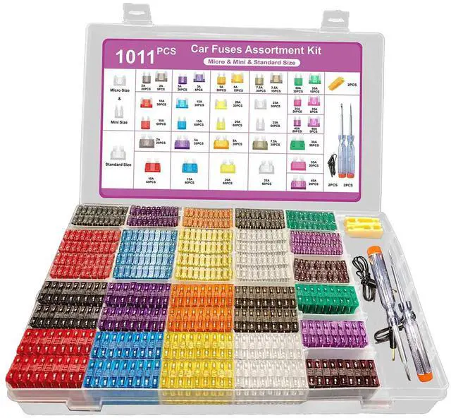 1011-Piece Universal Zinc Flake Car Fuse Set - 410 Standard, 410 Mini & 185 Micro Fuses (2A-40A), with 2 Removal Tools, 2 Testers & 2 Clips - Compatible with Cars, Trucks, RVs, Boats etc.