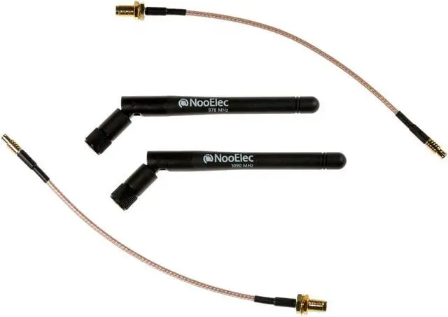 Bundle includes 4 ADS-B antennas, 3 RF cables, 2 RF adapters, 2 optional heatsinks, and 2 NESDR Nano 3 SDRs. Each SDR is lab-calibrated and EEPROM-programmed for simple Stratux software setup