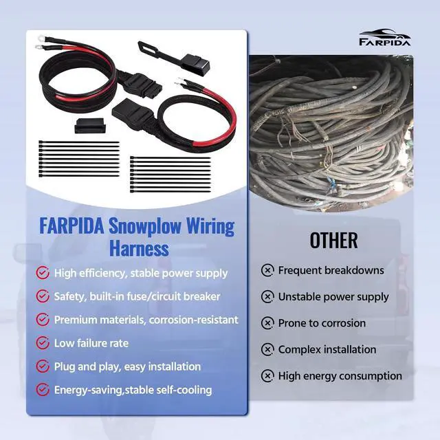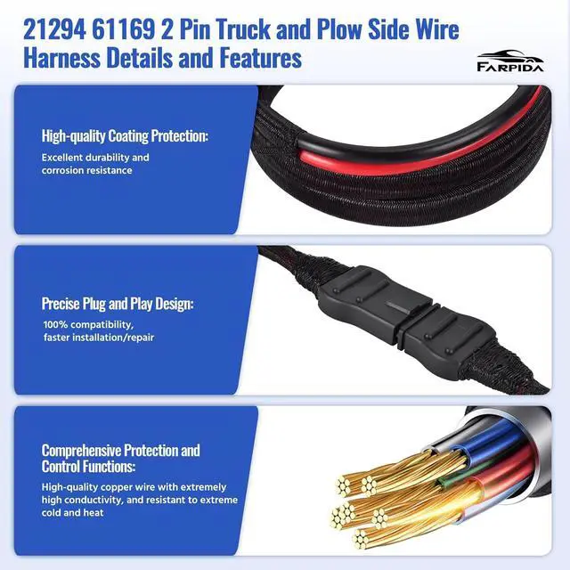 Products include21294 61169 truck plow side battery cable wiring harness set include 1×Plow side replace 21294 (33" Length), 1×Truck side replace 61169, 8274 (66" Length)12×tie wraps, 2×dust covers.