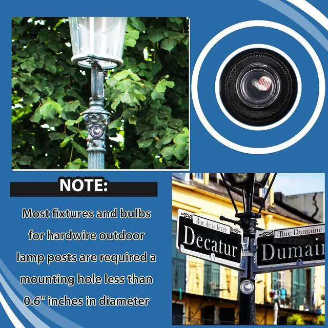 Easy to Install: the photo control can work with most fixtures and bulbs for hard wire outdoor lamp posts, which are required a mounting hole less than 0.6 inches in diameter. Disconnect power, remove junction box cover, place the photocell light switch in knockout hole and fasten with lock nut