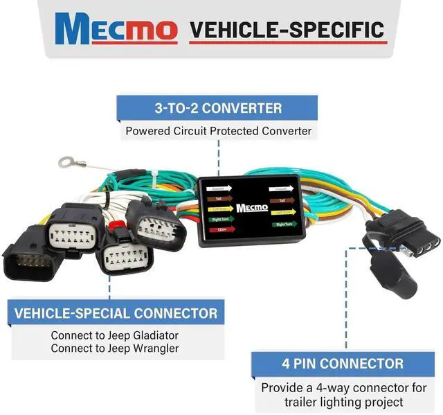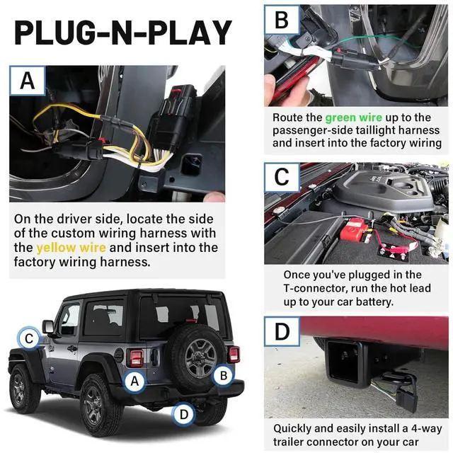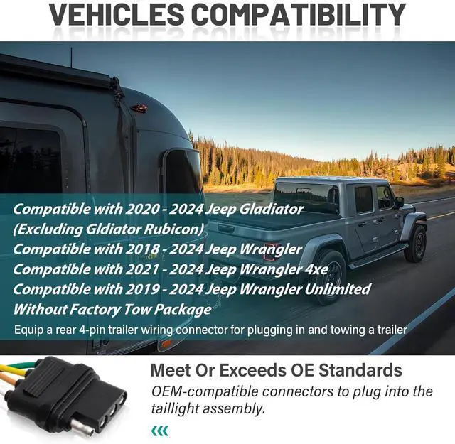 Wrangler & Gladiator: - Plug and play Wrangler 4xe T-connector harness for 18-Current Jeep Wrangler JL and 20+up Jeep Gladiator, pre-wired trailer hitch tow connector plugs directly into for Jeep Wrangler/ Jeep Gladiator existing wiring, which is located behind tail lights; Unplug the connection and insert the plug in Jeep Wrangler T-connector connector into the vehicle's harness